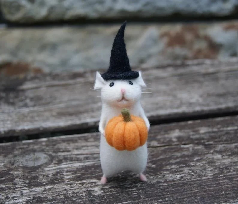 Needle felted Halloween mouse with black Halloween hat holding a pumpkin. The pumpkin is movable.