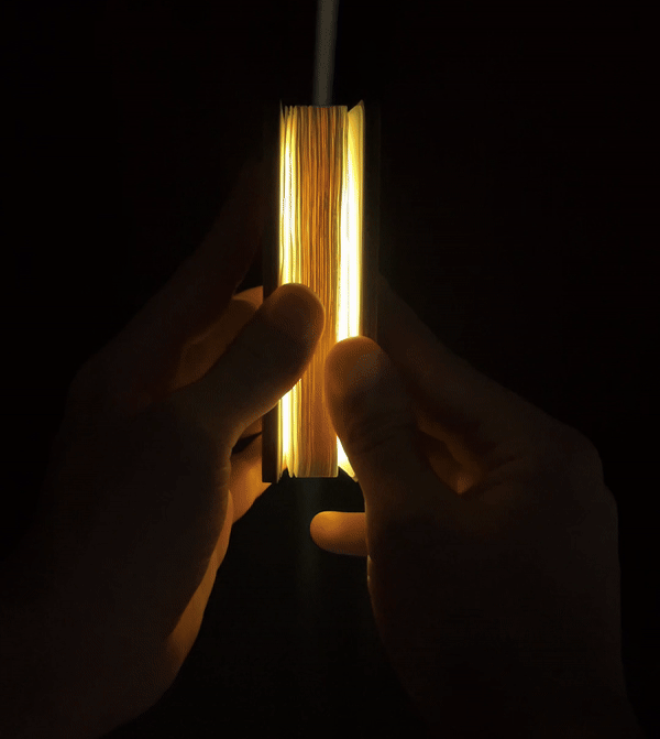 Like a real book, it opens to give off a warm glow to light up the room